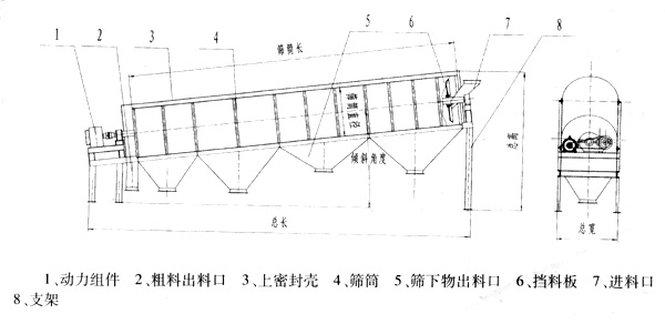 YTS圓筒回轉篩的主體結構是篩分筒,它是由若干個圓型狀篩網(wǎng)組成,整體與地平面成傾斜狀態(tài),外部被密封隔離罩所密封,以防止污染環(huán)境。通過變速減速系統(tǒng)使篩分筒在一定轉速下旋轉,物料自上而下通過篩分筒得到分離,細料從篩分筒前端下部排出,粗料從篩分筒下端尾部排出。圓筒回轉篩可設有梳型清篩機構,在篩分過程中可通過梳型清篩機構與篩分筒的相對運動,達到對篩體不間斷清理的效果,使篩分筒在整個工作過程中始終保持清潔、不粘、不堵、不影響篩分效果。